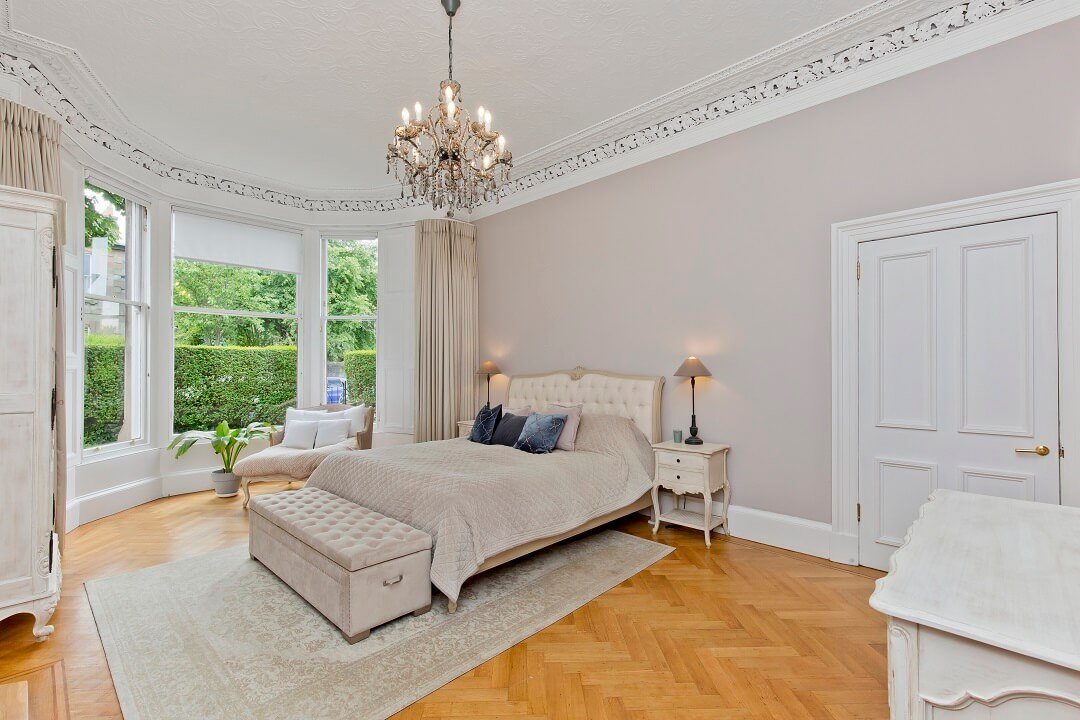 The particularly impressive principal bedroom occupies a generous footprint, offering fantastic flexibility for endless furniture configurations. The room is fronted by a large, southwest-facing bay window capturing wonderful sunny light throughout the day and framing leafy views, whilst a relaxing ambience is created by pared-back neutral décor and herringbone wood flooring. Exquisitely detailed cornicing, a fireplace, and an Edinburgh press add lovely period charm to the space. The remaining two bedrooms (both with built-in storage) are also good-sized doubles and continue the attractive presentation of the preceding accommodation with neutral hues and fitted carpets for optimum comfort underfoot, whilst one also retains its stunning cornicing and affords external access.