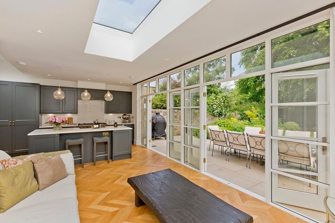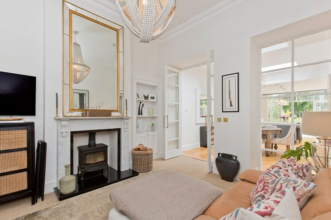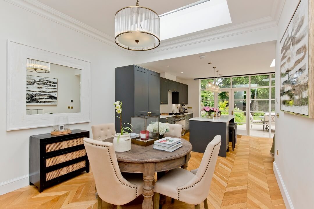 Sure to be the hub of this wonderful city home and undoubtedly appealing to those who love to host dinner parties, is the open-plan breakfasting kitchen, dining, and family room. The room enjoys fantastic natural light throughout the day owing to swathes of glass, including two large skylights and almost a full back wall of glazing with two sets of French doors opening onto the rear garden – perfect for alfresco dining and family recreation during the warmer months. The kitchen is beautifully appointed with timeless navy-blue cabinetry, including a central breakfasting island, immaculate quartz worktops, and a double Belfast sink. There is space for a range cooker to be neatly housed within the cabinets and paired with a quartz splashback and an extractor fan, with additional integrated appliances comprising a fridge/freezer and a dishwasher. A cupboard offers space for a washing machine and dryer.