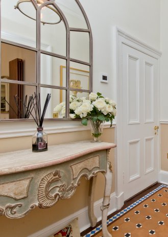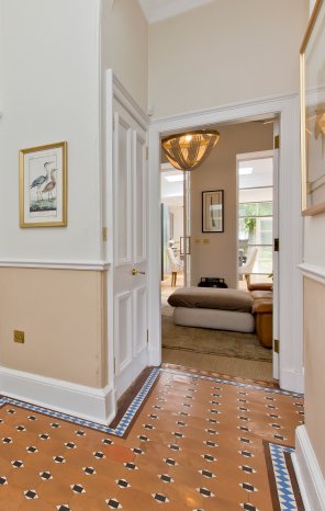 A shared entrance and vestibule leads to the home’s front door, where you are welcomed inside by an inviting and airy hallway, immediately setting the tone for the interiors to follow with neutral two-tone décor and eye-catching original floor tiles. The hall also benefits from useful built-in storage.